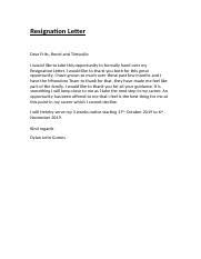 I am writing to inform you of my resignation I will be leaving my position as fast food server on April 2 2015 I have decided to focus on my school work and extra curricular activities as I prepare for college acceptance I.