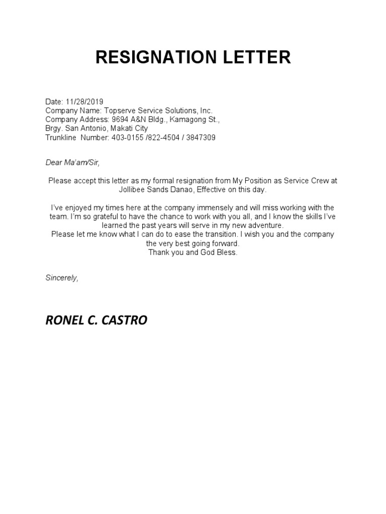 Resignation Letter Fast Food Service Crew
